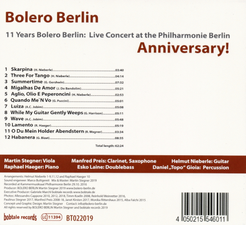 Im Jahre 2008 wurde das mit Berliner Philharmonikern und zwei Jazzern besetzte Ensemble gegründet. Aus dem Stand begeisterte der unnachahmlich eigene kammermusikalische Sound von Bolero Berlin das Publikum. Mit einer Live-Aufnahme eines Konzerts in der Berliner Philharmonie feiert das Ensemble nun schon elf Jahre voller Sternstunden, was Auftritte, Arrangements, Aufnahmen und Repertoire betrifft - glücklicherweise erschienen bei bobtale records.