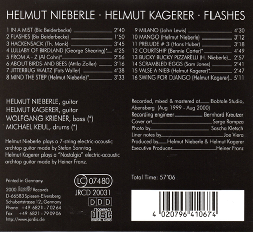 Dies ist die vierte CD des Gitarrenduos Helmut Nieberle / Helmut Kagerer. Die beiden arbeiten seit 13 Jahren zusammen. Was sie eint, ist nicht nur die Liebe zum Jazz und die Tatsache, dass sie beidee in derselben Stadt, Regensburg, wohnen, sondern auch ein traumhaft sicheres Zusammenspiel, das von rhythmischer Finesse, Geschmack und Einfallsreichtum auch in den Details geprägt ist.