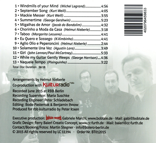 „Naquele Tempo“ – Bolero Berlin begibt sich mit neuem Album auf eine melancholische Zeitreise. Brasilianische Chorinhos und mexikanische Boleros erklingen Seite an Seite mit Jazz-Standards wie George Gershwins Summertime, Songs und Balladen von Kurt Weill, Beatles-Klassikern und Kompositionen von Helmut Nieberle.