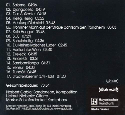 Norbert Gabla - Bandoneon, Komposition Helmut Nieberle - 7-string guitar Markus Schieferdecker - Kontrabass